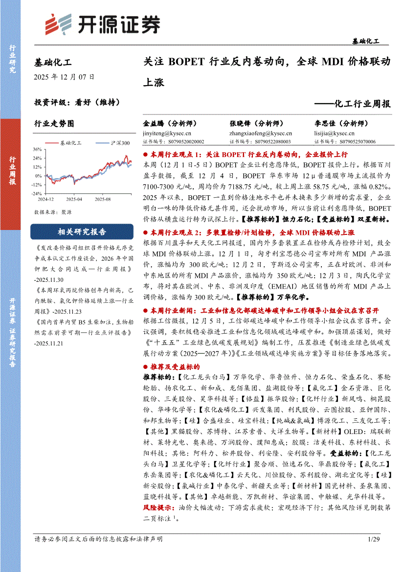 化工行业:开源证券-化工行业周报:关注BOPET行业反内卷动向,全球MDI价格联动上涨-251207