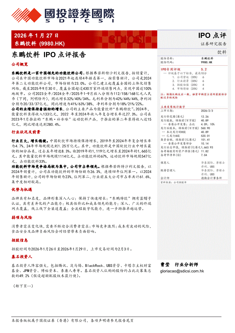 国投证券国际-IPO点评报告:东鹏饮料(9980.HK)-260127