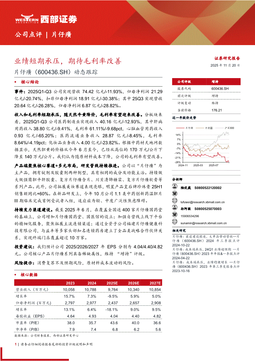 片仔癀:西部证券-片仔癀-600436-动态跟踪:业绩短期承压,期待毛利率改善-251120