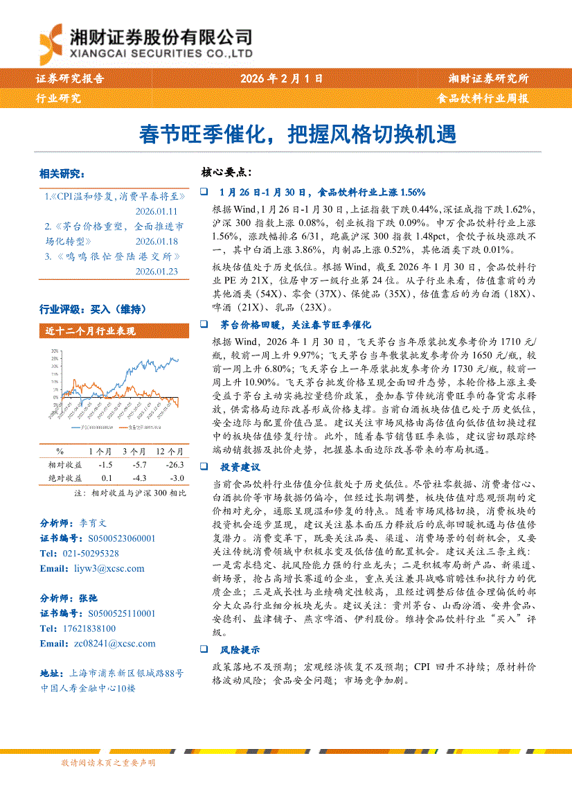 食品饮料行业:湘财证券-食品饮料行业周报:春节旺季催化,把握风格切换机遇-260201
