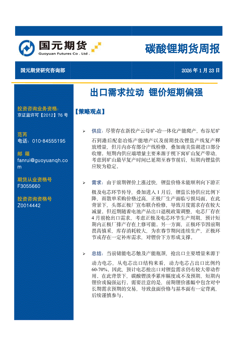 国元期货-碳酸锂期货周报:出口需求拉动,锂价短期偏强-260123