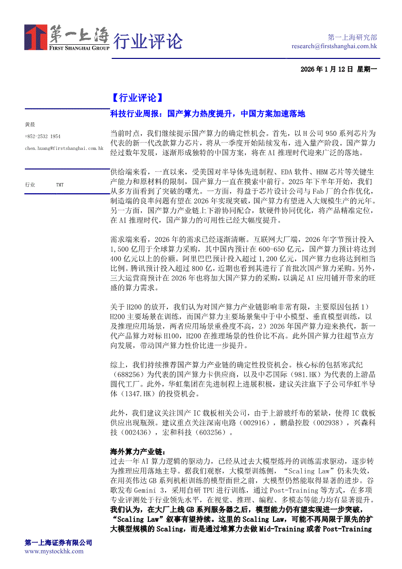 科技行业:第一上海-科技行业周报:国产算力热度提升,中国方案加速落地-260112