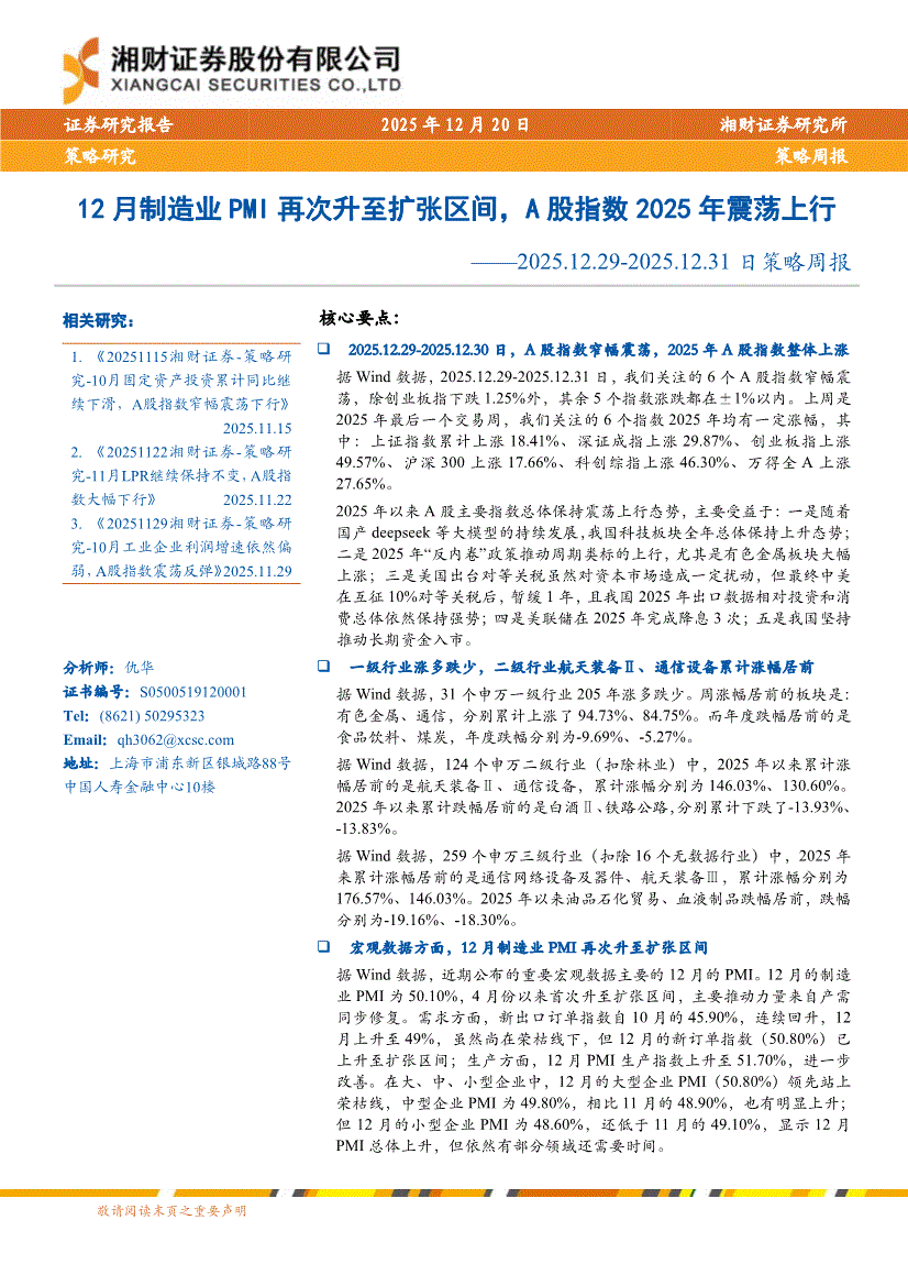 湘财证券-2025.12.29~2025.12.31日策略周报:12月制造业PMI再次升至扩张区间,A股指数2025年震荡上行-251220