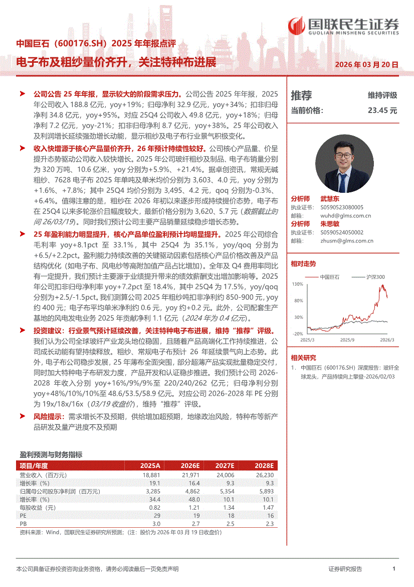 中国巨石:国联民生证券-中国巨石-600176-2025年年报点评:电子布及粗纱量价齐升,关注特种布进展-260320