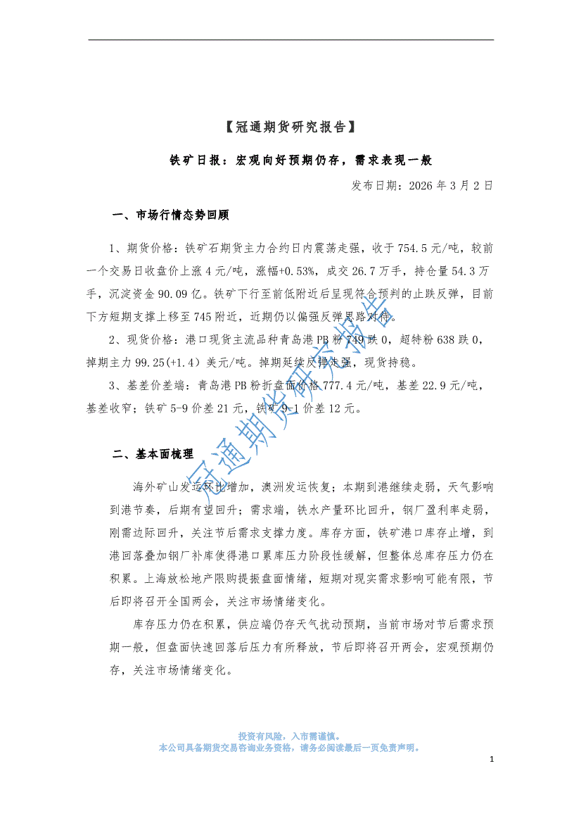 冠通期货-铁矿日报:宏观向好预期仍存,需求表现一般-260302