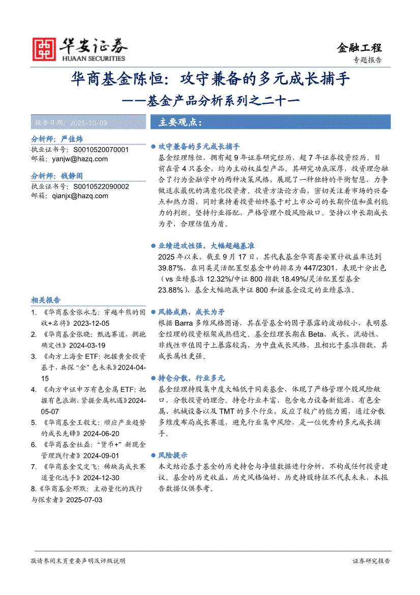 华安证券-基金产品分析系列之二十一:华商基金陈恒,攻守兼备的多元成长捕手-251009