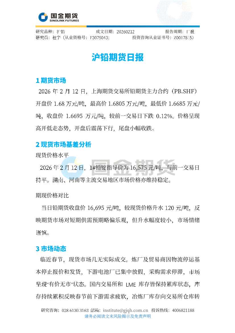 国金期货-沪铅期货日报-260212