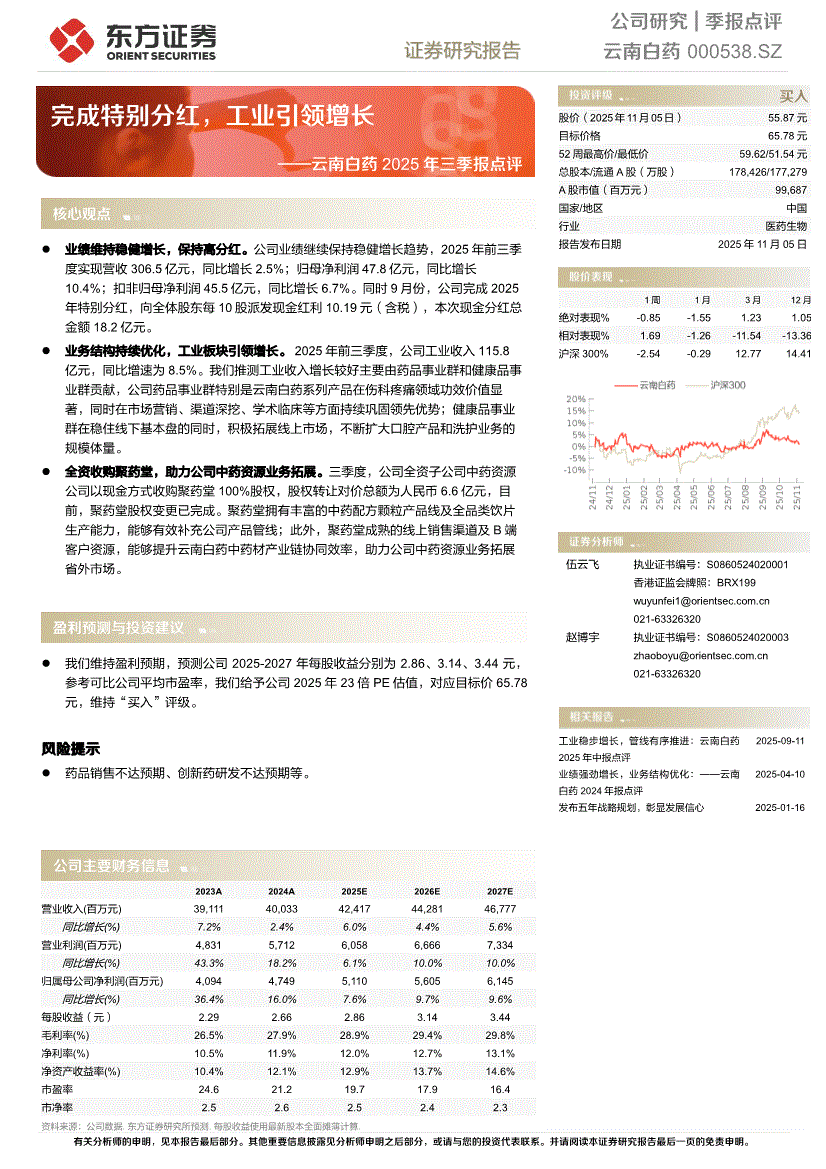 云南白药:东方证券-云南白药-000538-2025年三季报点评:完成特别分红,工业引领增长-251105