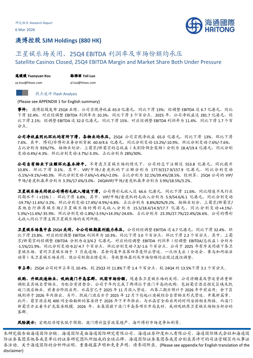 澳博控股:海通国际-澳博控股-0880.HK-卫星娱乐场关闭,25Q4 EBITDA利润率及市场份额均承压-260306