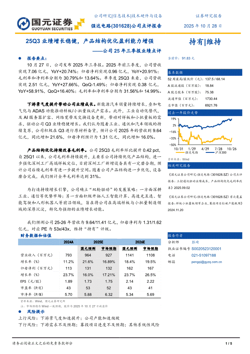 强达电路:国元证券-强达电路-301628-公司25年三季报业绩点评:25Q3业绩增长稳健,产品结构优化盈利能力增强-251028