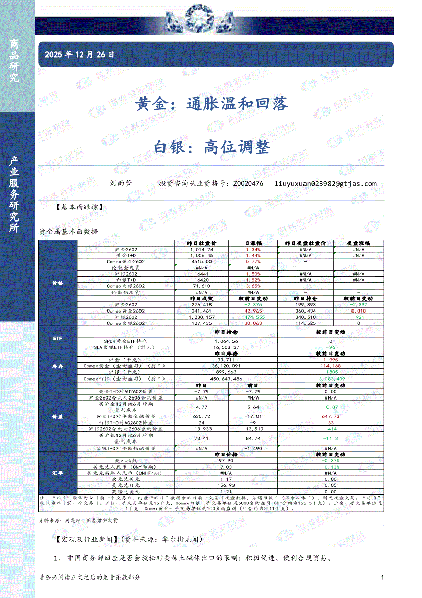 国泰君安期货-黄金:通胀温和回落,白银,高位调整-251226