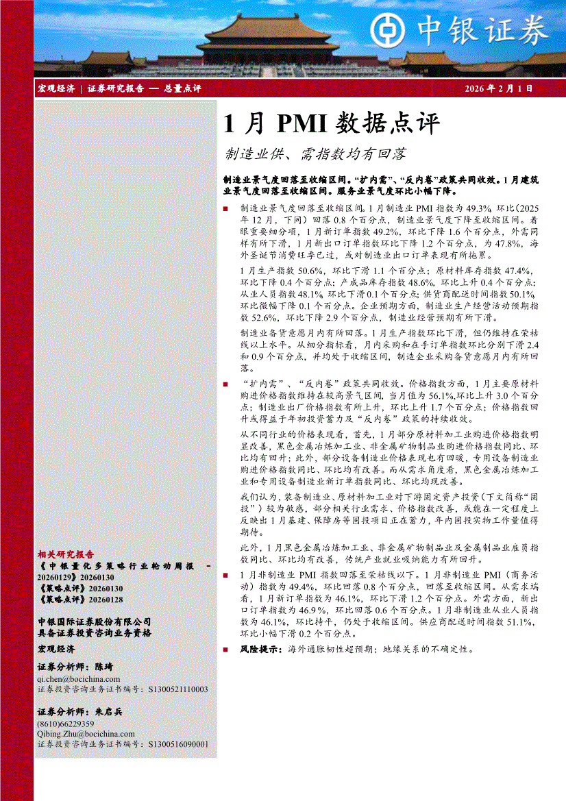 中银国际-1月PMI数据点评:制造业供、需指数均有回落-260201