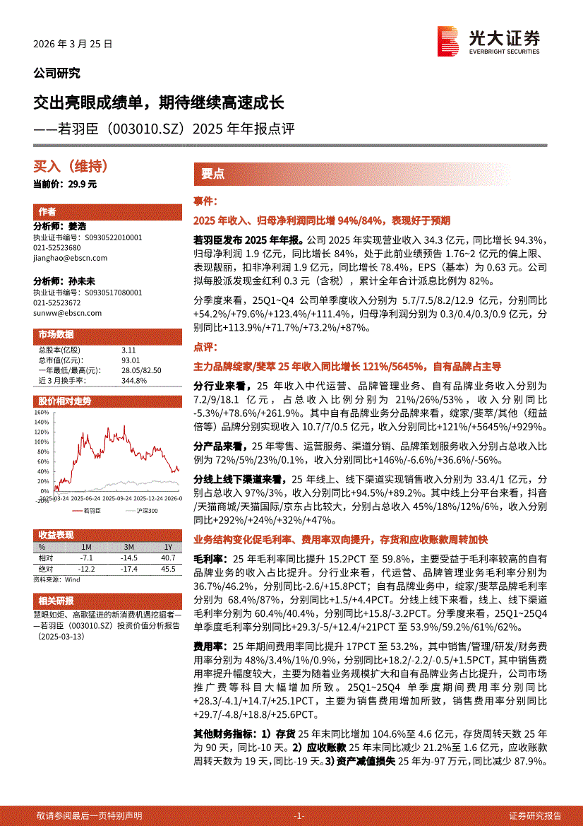 若羽臣:光大证券-若羽臣-003010-2025年年报点评:交出亮眼成绩单,期待继续高速成长-260325