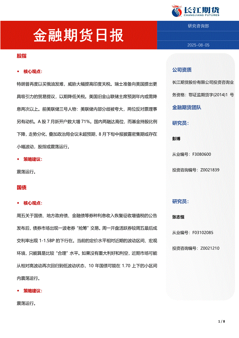 长江期货-股指或震荡加剧,国债或震荡运行-250818