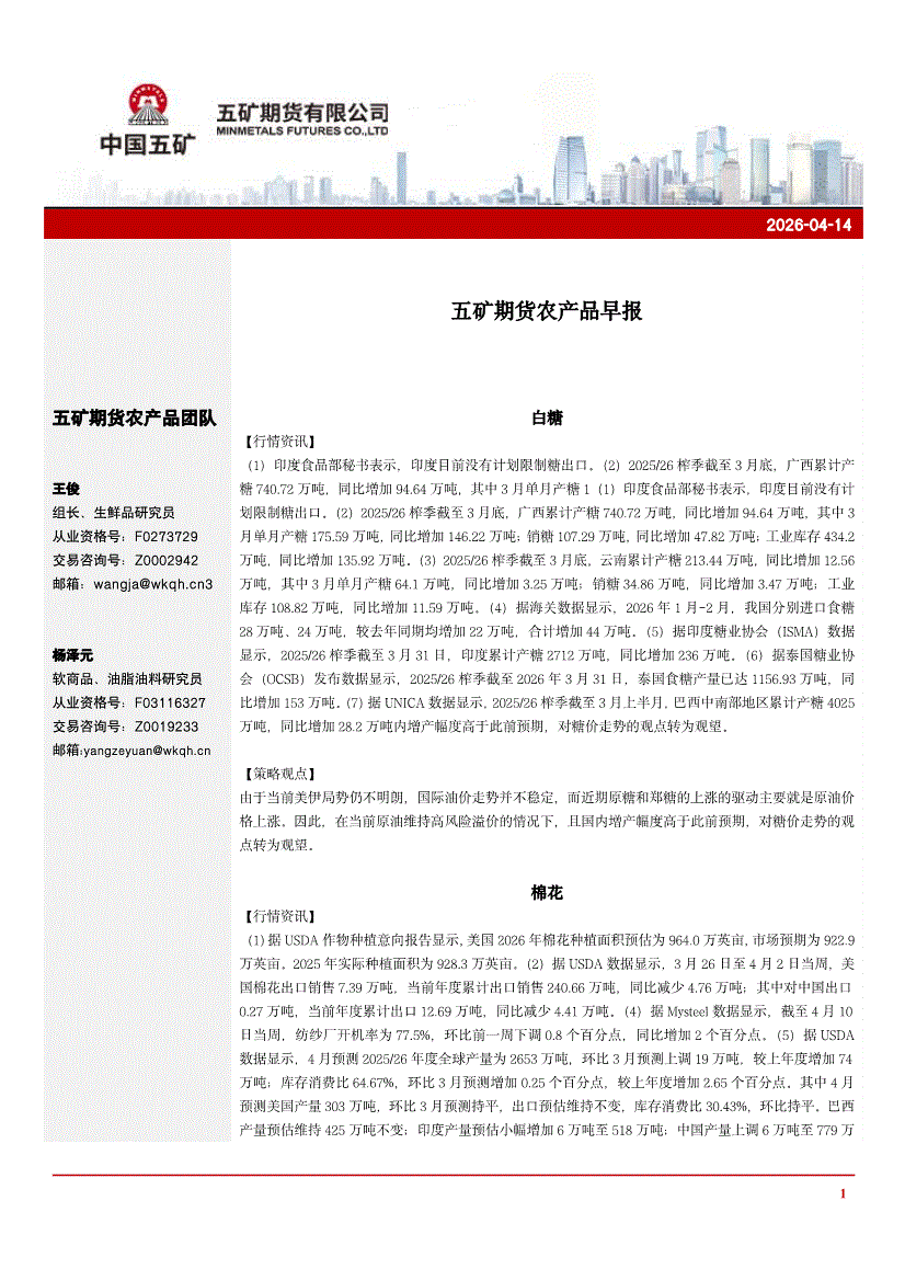 五矿期货-棉花周报:博弈政策预期,郑棉价格上涨-260411