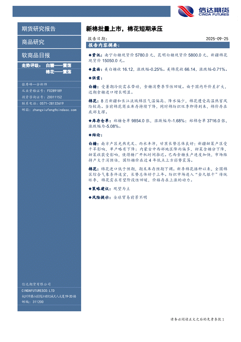 信达期货-软商品日报:新棉批量上市,棉花短期承压-250925