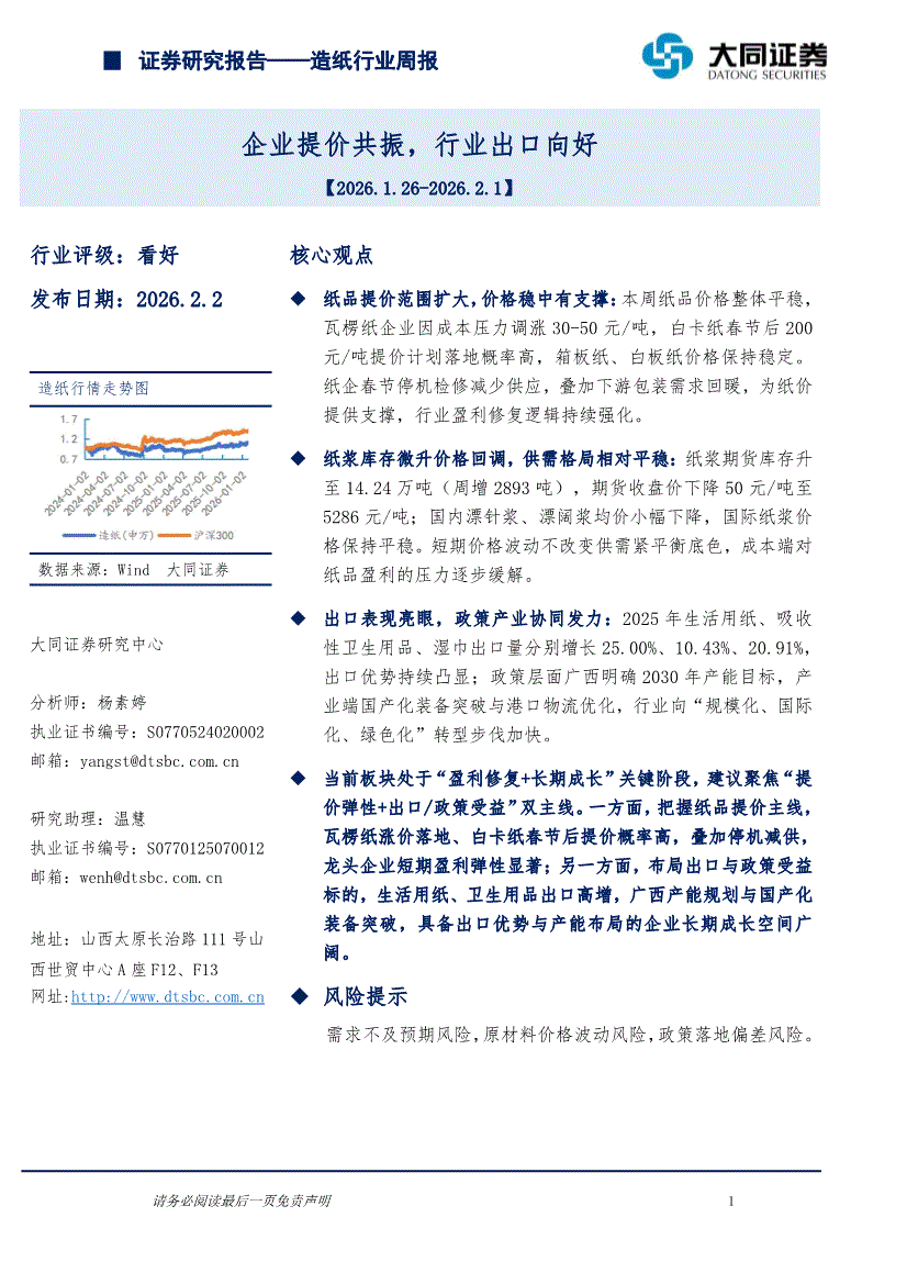 造纸行业:大同证券-造纸行业周报:企业提价共振,行业出口向好-260202