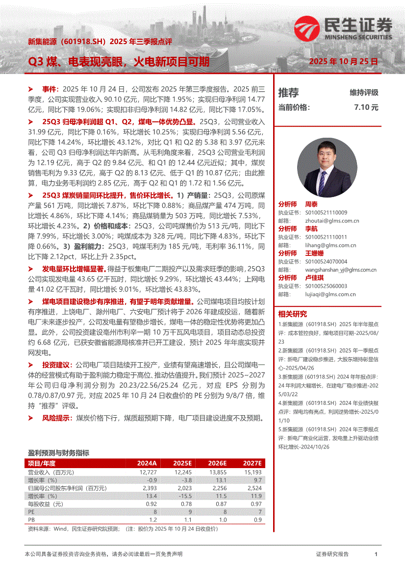 新集能源:民生证券-新集能源-601918-2025年三季报点评:Q3煤、电表现亮眼,火电新项目可期-251025