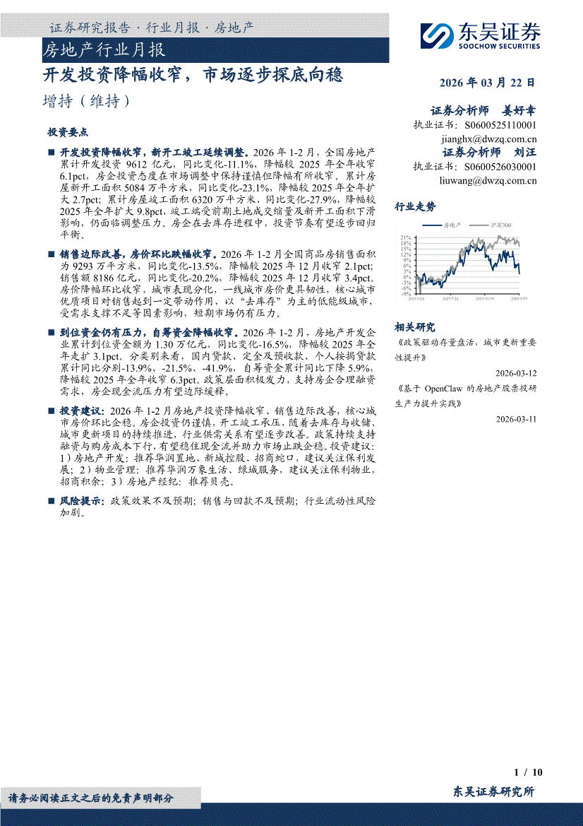房地产行业:东吴证券-房地产行业月报:开发投资降幅收窄,市场逐步探底向稳-260322