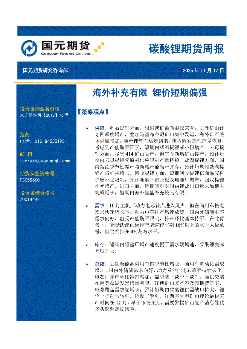 国元期货-碳酸锂期货周报:海外补充有限,锂价短期偏强-251117