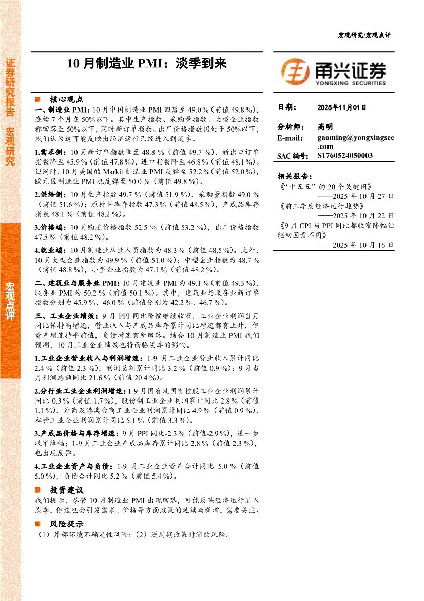 甬兴证券-10月制造业PMI:淡季到来-251101