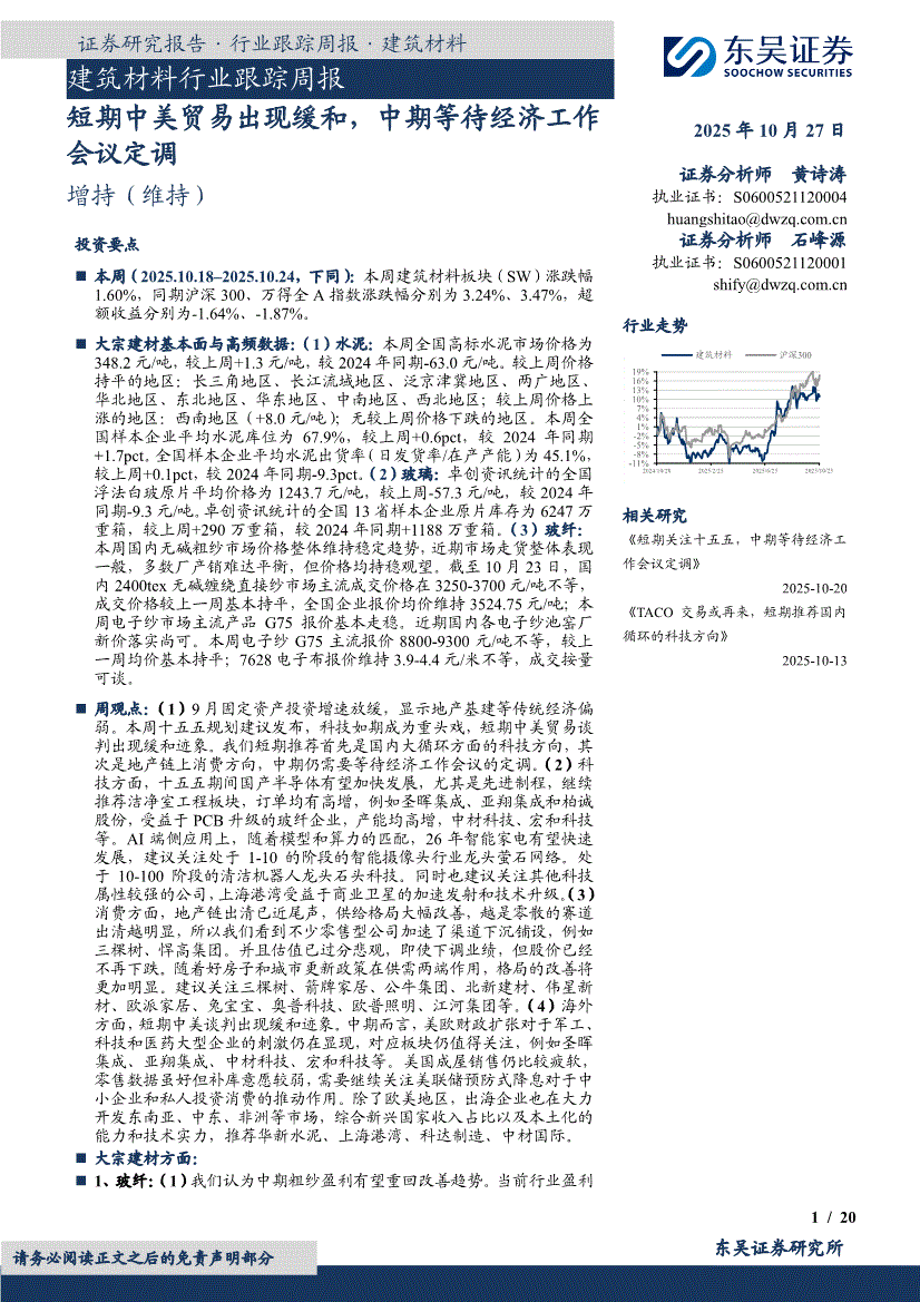 建筑材料行业:东吴证券-建筑材料行业跟踪周报:短期中美贸易出现缓和,中期等待经济工作会议定调-251027