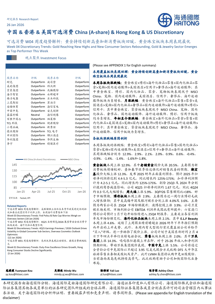 可选消费行业:海通国际-中国&香港&美国可选消费行业:可选消费W04周度趋势解析,黄金持续创新高叠加新消费板块回暖,黄金珠宝板块本周表现最优-260126