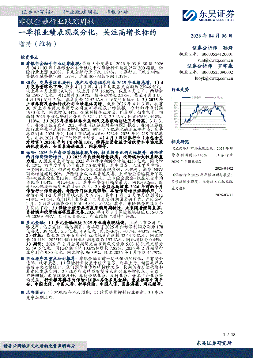 非银金融行业:东吴证券-非银金融行业跟踪周报:一季报业绩表现或分化,关注高增长标的-260406