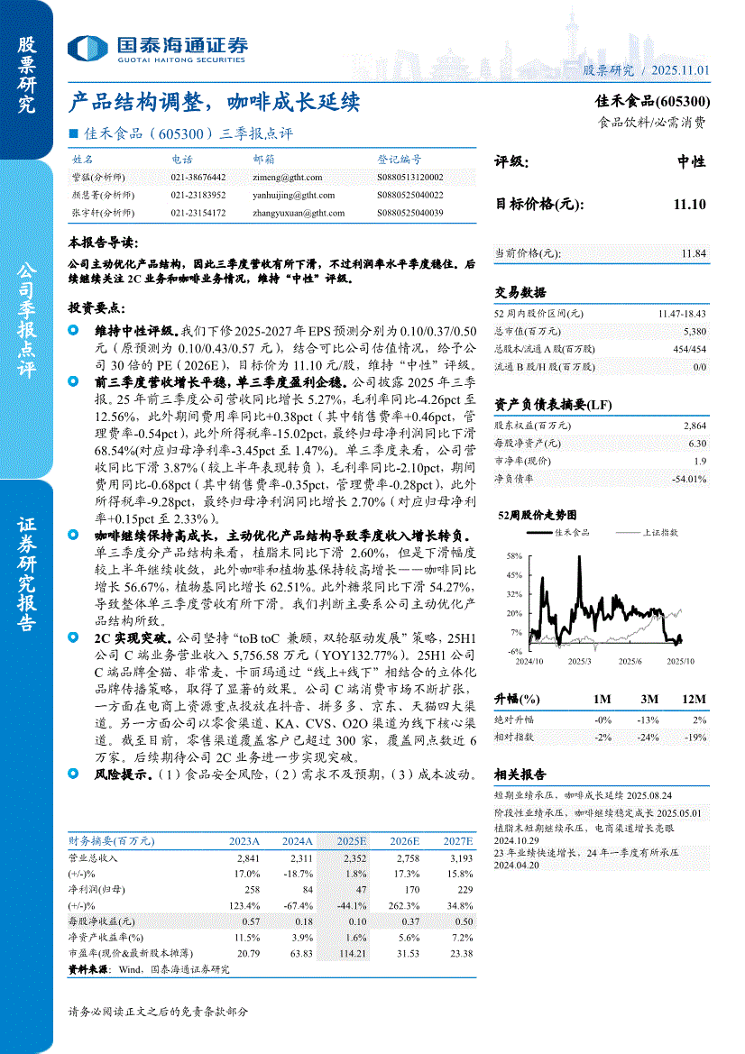佳禾食品:国泰海通证券-佳禾食品-605300-三季报点评:产品结构调整,咖啡成长延续-251101