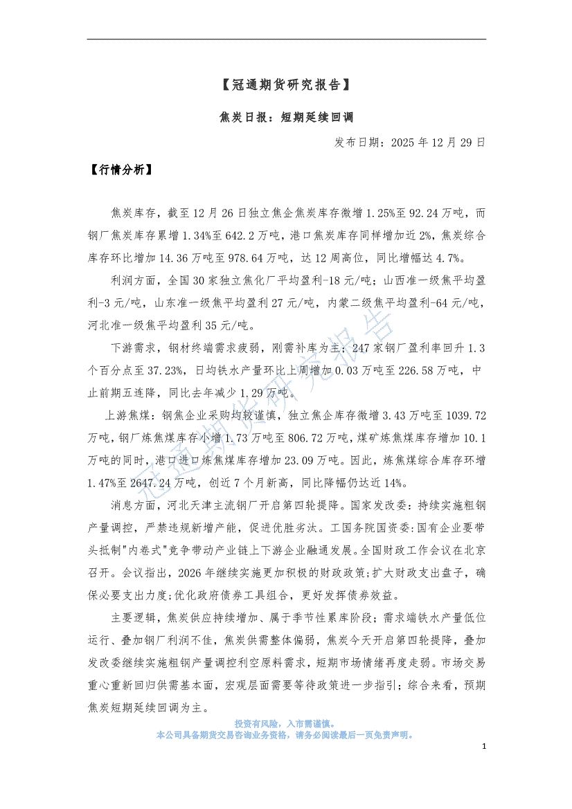 冠通期货-焦炭日报:短期延续偏强运行-251224