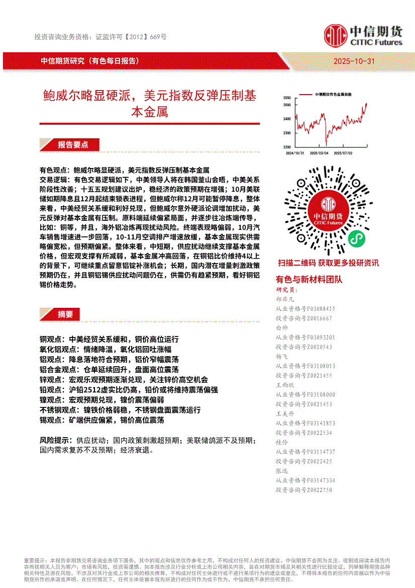 中信期货-有色每日报告:鲍威尔略显硬派,美元指数反弹压制基本金属-251031