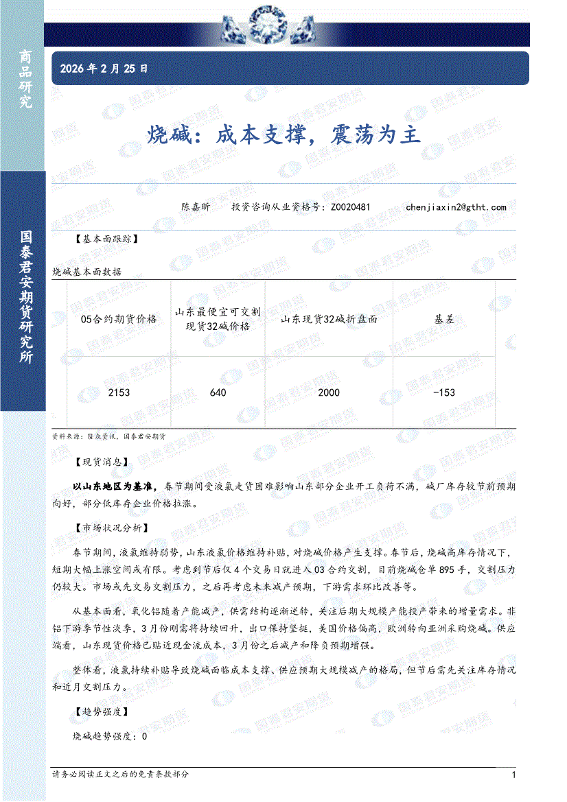 国泰君安期货-烧碱:成本支撑,震荡为主-260225