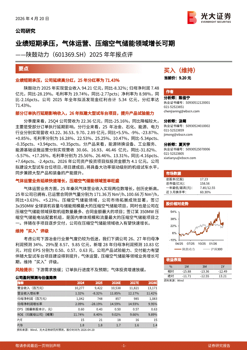光大证券-陕鼓动力-601369-2025年年报点评:业绩短期承压,气体运营、压缩空气储能领域增长可期-260420