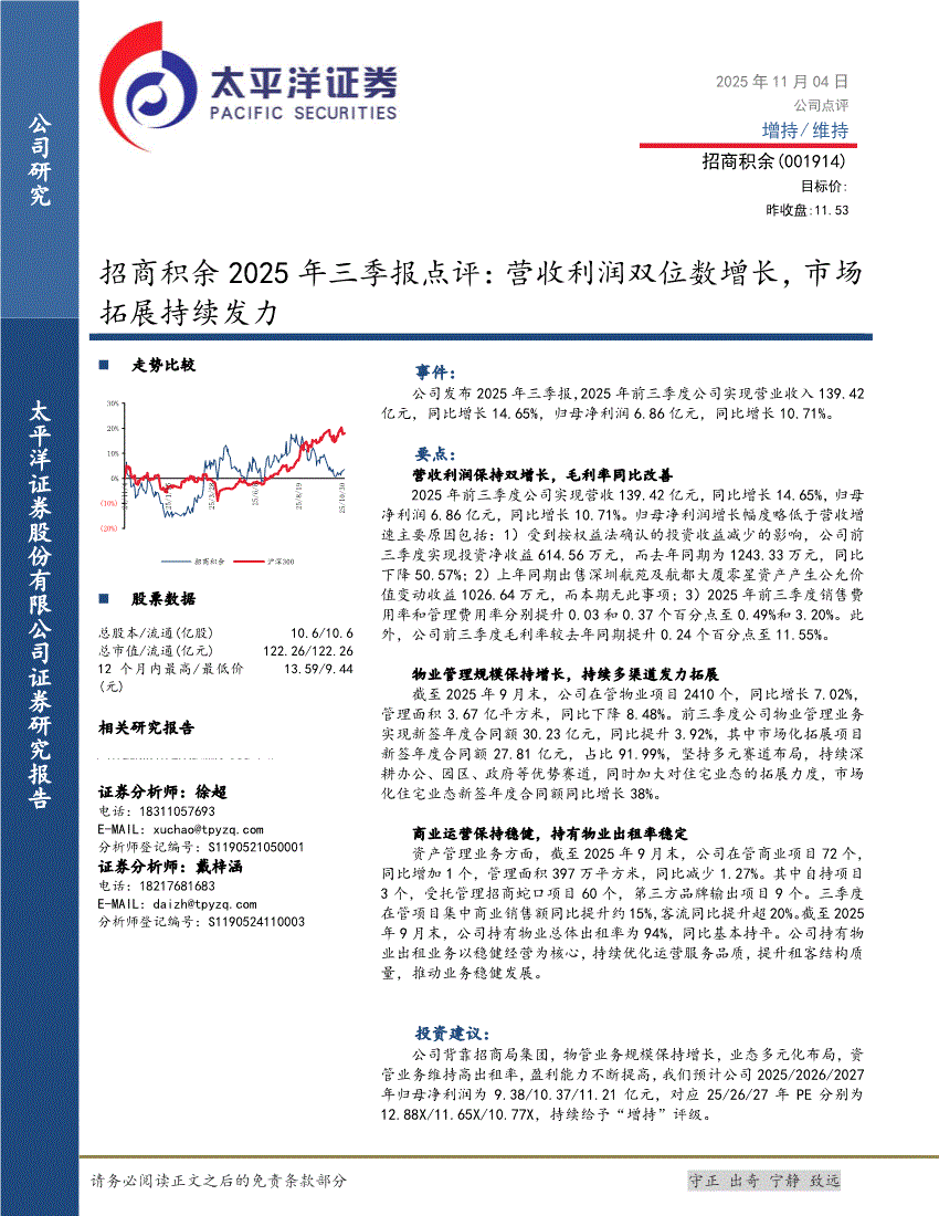 招商积余:太平洋证券-招商积余-001914-2025年三季报点评:营收利润双位数增长,市场拓展持续发力-251104