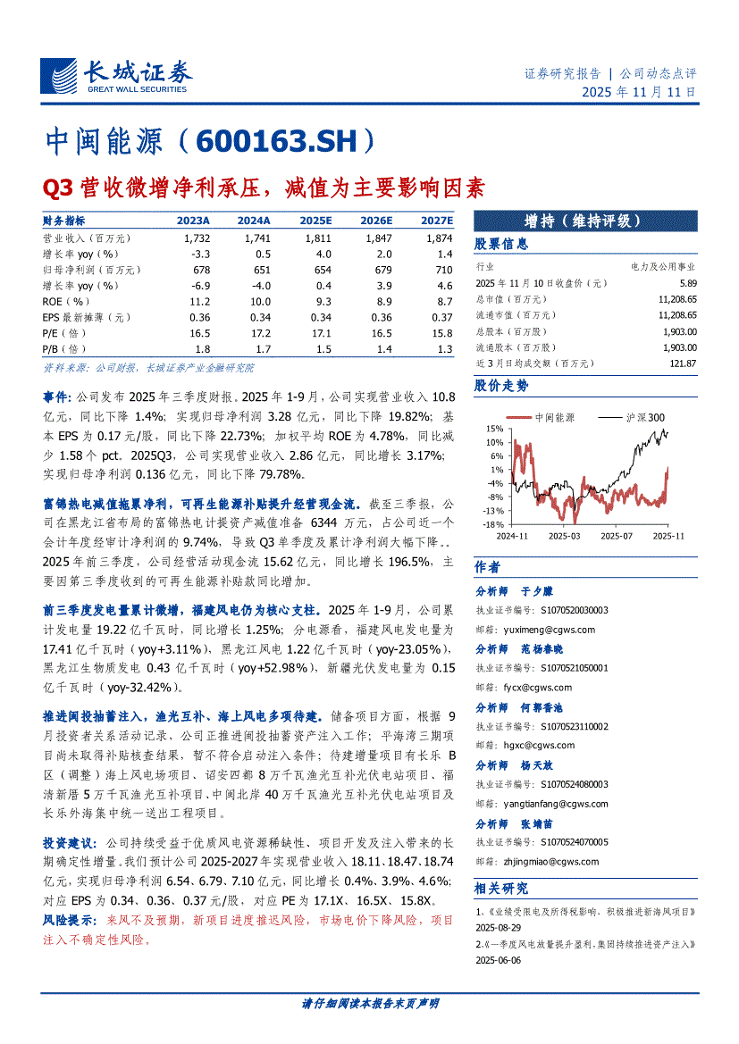 中闽能源:长城证券-中闽能源-600163-Q3营收微增净利承压,减值为主要影响因素-251111