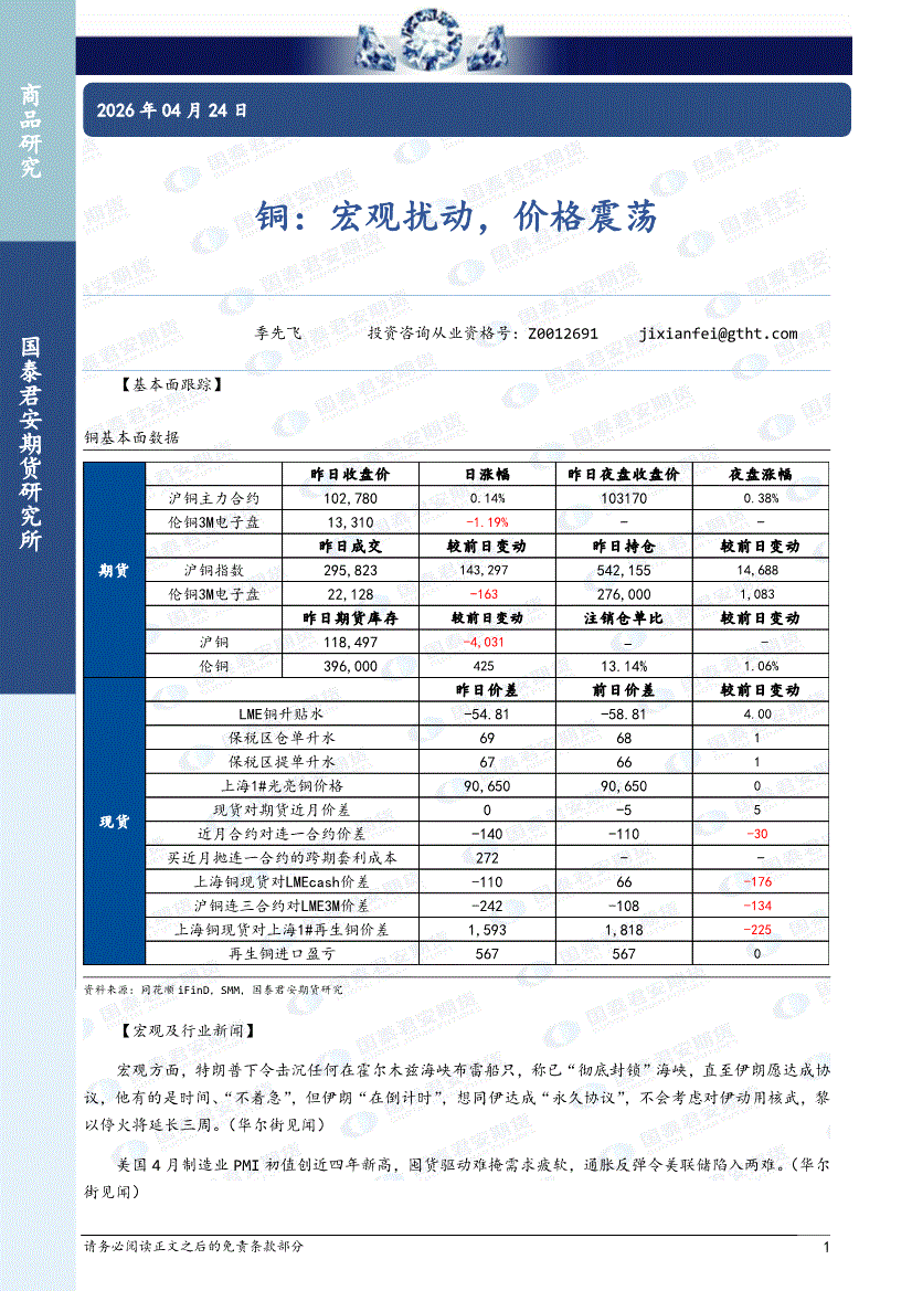 国泰君安期货-铜:宏观扰动,价格震荡-260424