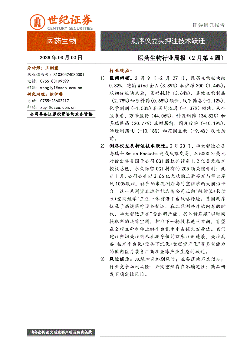 医药生物行业:世纪证券-医药生物行业周报(2月第4周):测序仪龙头押注技术跃迁-260302