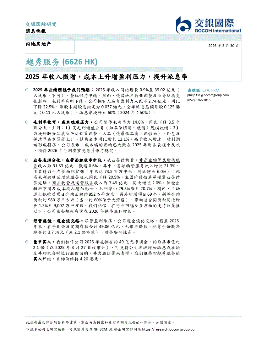 越秀服务:交银国际-越秀服务-6626.HK-2025年收入微增,成本上升增盈利压力,提升派息率-260330
