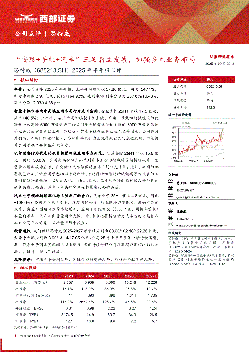 思特威:西部证券-思特威-688213-2025年半年报点评:“安防+手机+汽车”三足鼎立发展,加强多元业务布局-250929