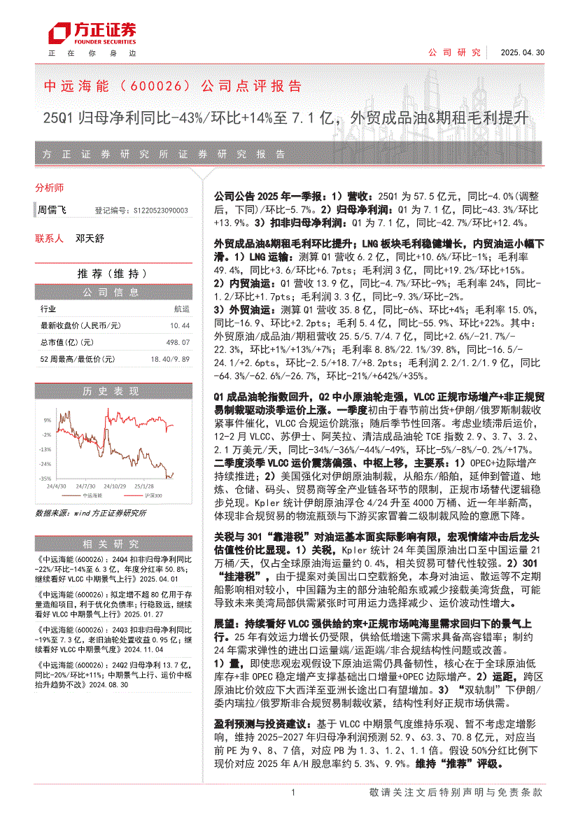 中远海能:方正证券-中远海能-600026-公司点评报告:25Q1归母净利同比下降43%/环比+14%至7.1亿,外贸成品油&期租毛利提升-250430
