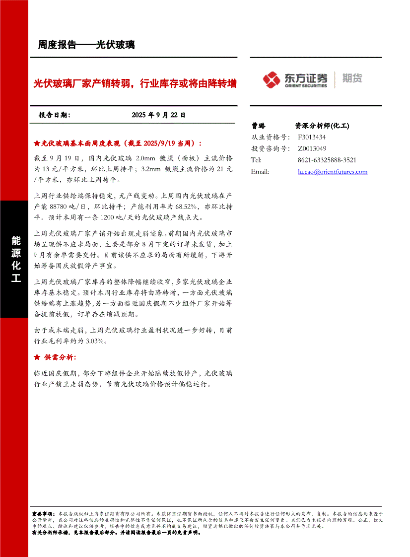 东证期货-光伏玻璃周度报告:光伏玻璃厂家产销转弱,行业库存或将由降转增-250922