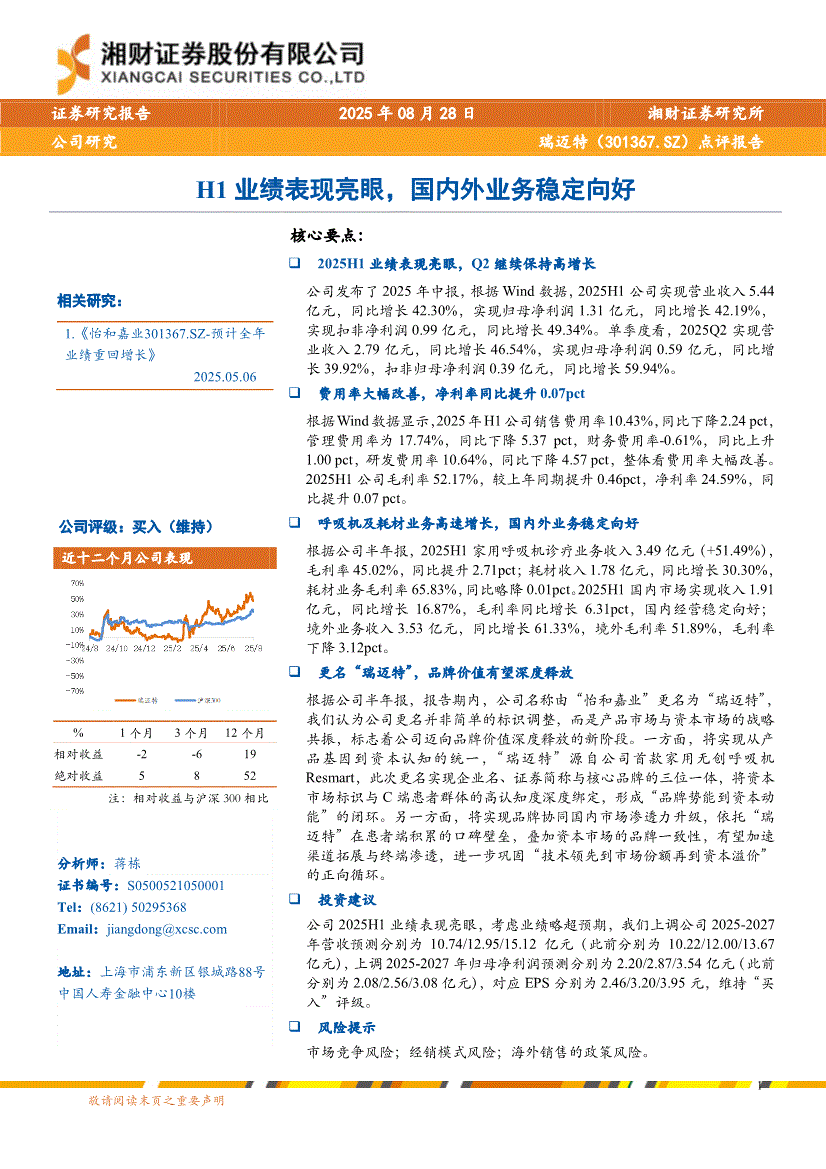 瑞迈特:湘财证券-瑞迈特-301367-点评报告:H1业绩表现亮眼,国内外业务稳定向好-250828