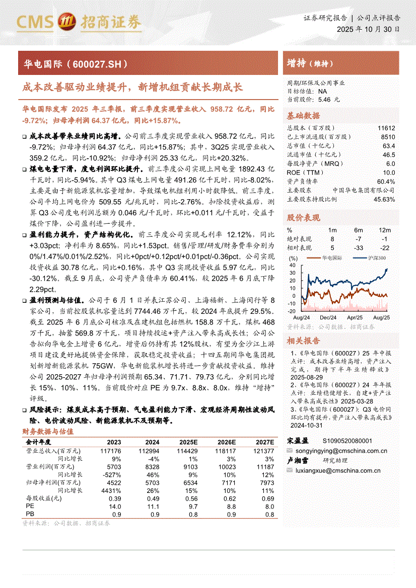 华电国际:招商证券-华电国际-600027-成本改善驱动业绩提升,新增机组贡献长期成长-251030