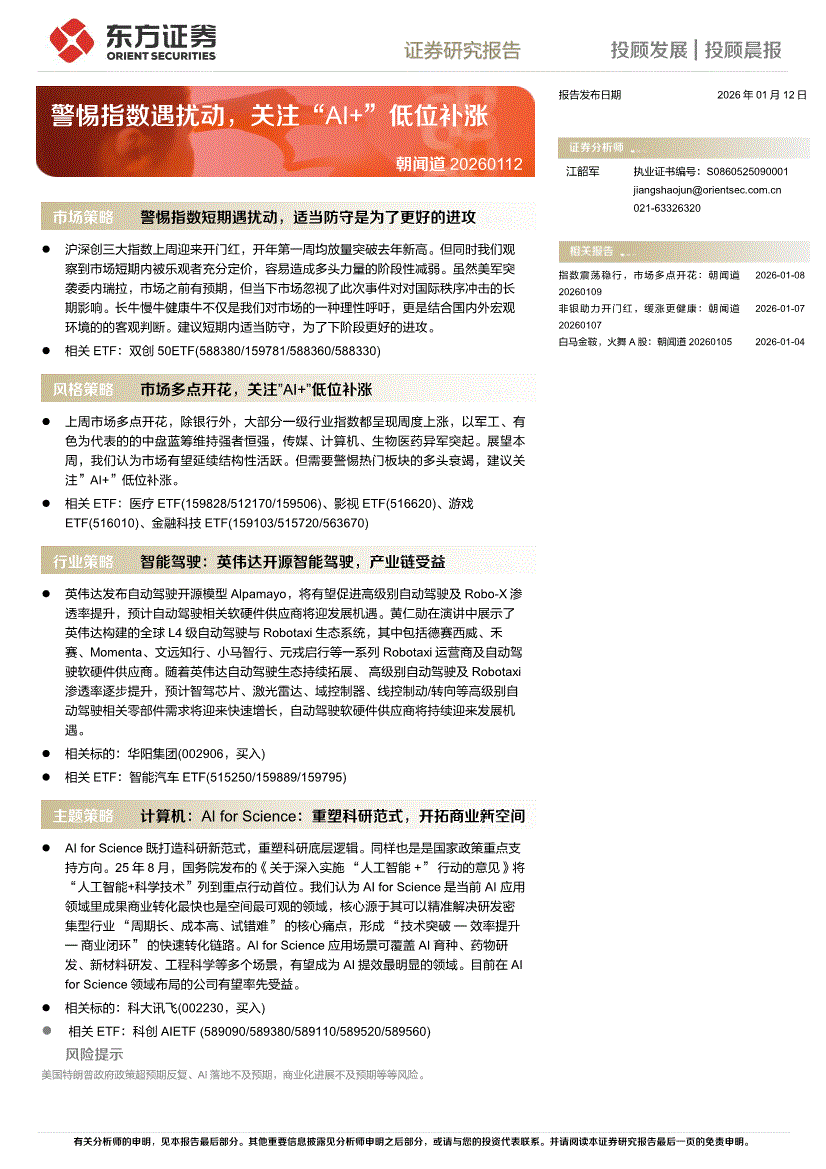 东方证券-朝闻道:警惕指数遇扰动,关注“AI+”低位补涨-260112