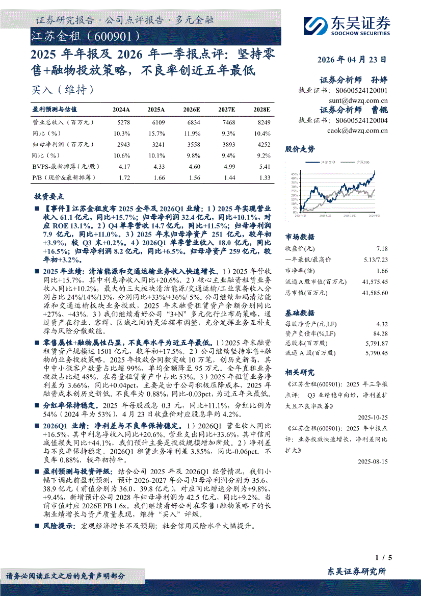 江苏金租:东吴证券-江苏金租-600901-2025年年报及2026年一季报点评:坚持零售+融物投放策略,不良率创近五年最低-260423