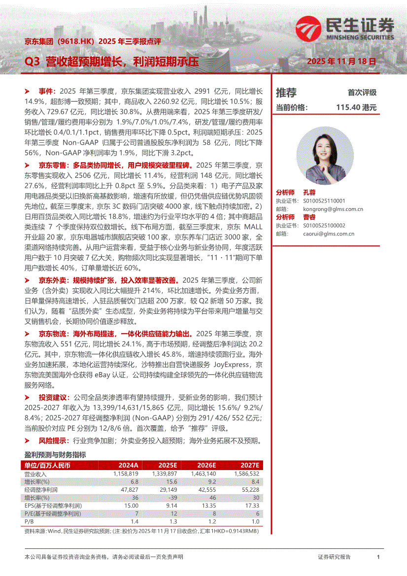 京东集团:民生证券-京东集团-9618.HK-2025年三季报点评:Q3营收超预期增长,利润短期承压-251118