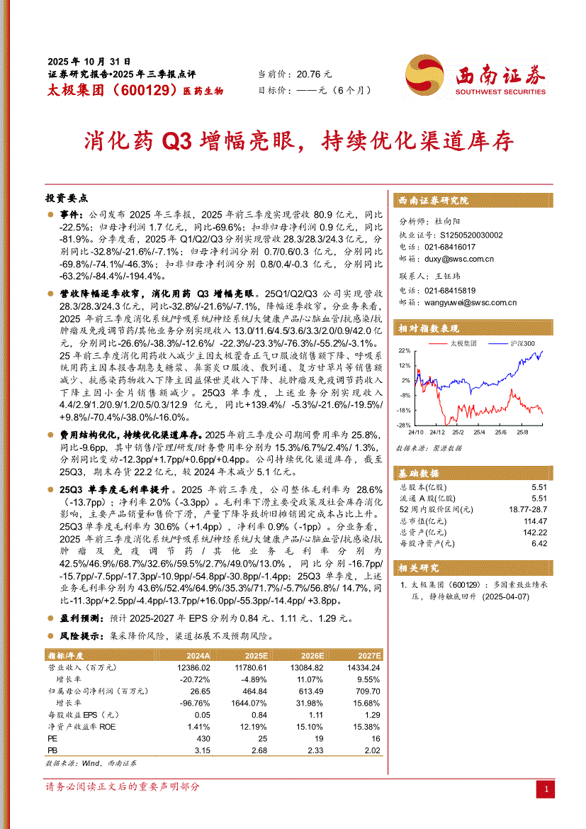 太极集团:西南证券-太极集团-600129-消化药Q3增幅亮眼,持续优化渠道库存-251031