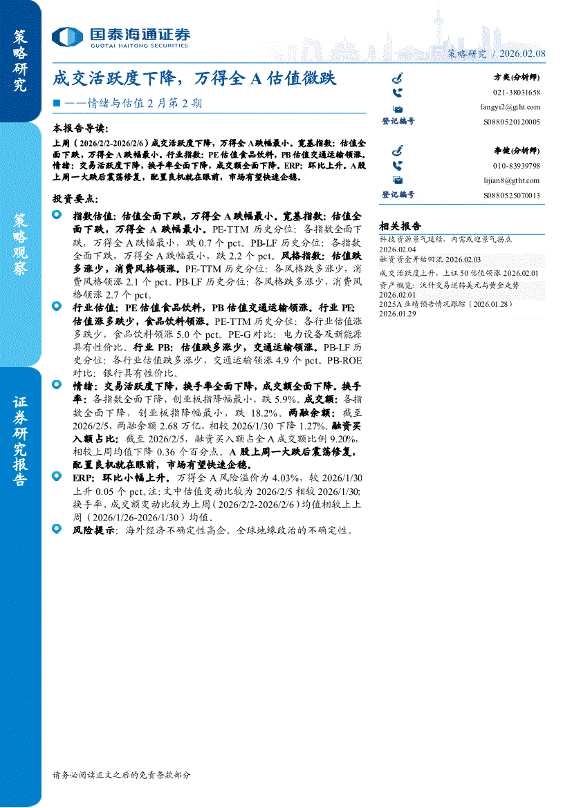 国泰海通证券-情绪与估值2月第2期:成交活跃度下降,万得全A估值微跌-260208