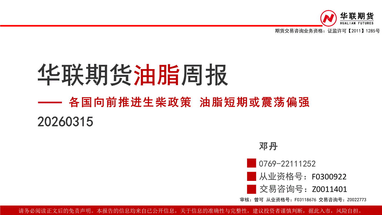 华联期货-油脂周报:各国向前推进生柴政策,油脂短期或震荡偏强-260315