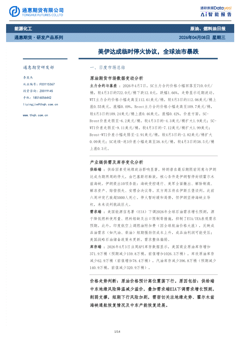 通惠期货-原油、燃料油日报:美伊达成临时停火协议,全球油市暴跌-260408